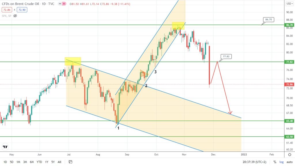 Нефть марки Brent очень уверенно пробила уровень поддержки 77.82 и направляется в сторону 70-й фигуры. Базовый сценарий – достижение линии пробитого нисходящего канала, но перед этим котировки могут сходить на север и протестировать пробитую горизонталь: