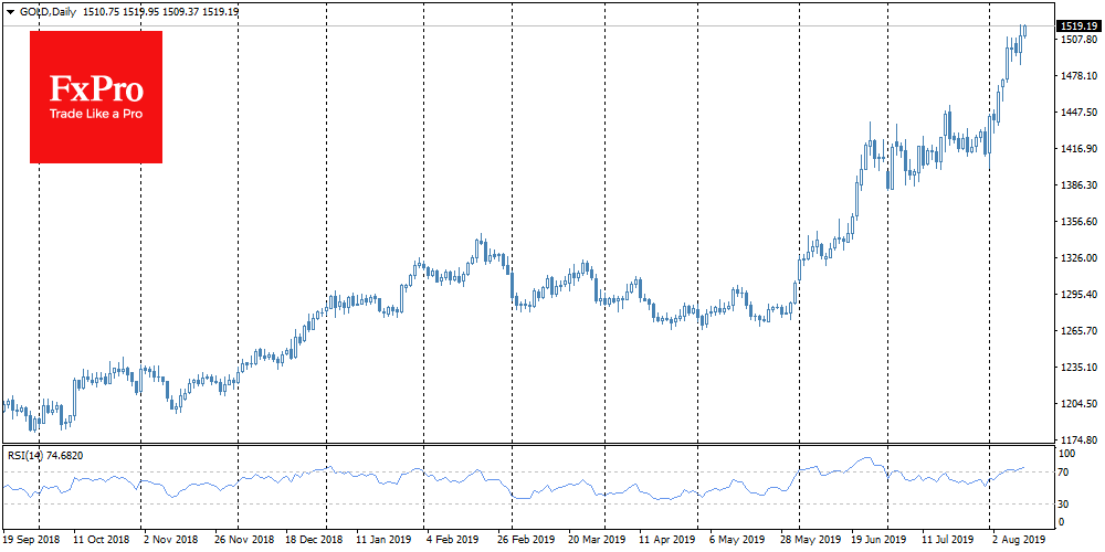 Среди основных причин бегства из рисковых активов – нарастание напряженности вокруг беспорядков в Гонконге и неожиданное поражение действующего президента Аргентины Маурисио Макри на предварительном этапе выборов. Эта новость обрушила в понедельник национальные фондовые рынки и отправило аргентинский песо на 15% вниз. Картину дополняют страхи перед отказом от прорыночных реформ и возможным продлением дефолта по долгам страны.