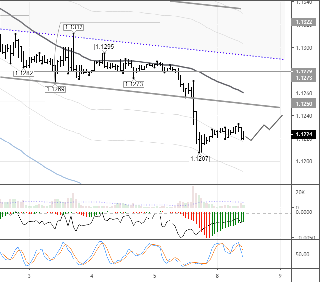 Восстановление цены ожидаем на фоне фиксации прибыли по коротким позициям до отметки 1,1240. Чем сильнее отскок вверх, тем выше вероятность восстановления цены до уровня 1,1290. Если покупателям не удастся преодолеть отметку 1,1250, то их ожидает новое снижение до уровня 1,1180.