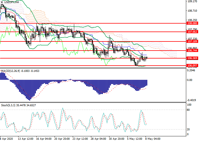 На 4-часовом графике наблюдается нисходящая коррекция. Инструмент закрепился в верхнем диапазоне полос Боллинджера, однако для подтверждения восходящего тренда необходим пробой уровня 106.55. Индикатор направлен вниз, а ценовой диапазон сократился, что указывает на продолжение формирование «медвежьего» тренда. Гистограмма MACD удерживает умеренный сигнал на продажу. Стохастик консолидируется в нейтральной зоне, сигнал для входа в рынок не сформирован.