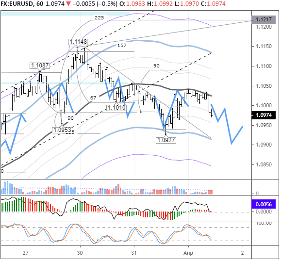 Во вторник, 31 марта, торги по евро завершились в небольшом минусе. После падения до 1,0927 цена восстановилась до 1,1039. Продавцы обновили минимум на фоне пробоя трендовой линии на торгах в Азии. Отскок был вызван решением ФРС США расширить возможности десятков иностранных центральных банков по доступу к долларам во время пандемии. Фондовые индексы в США упали с 1,0% до 1,8%.