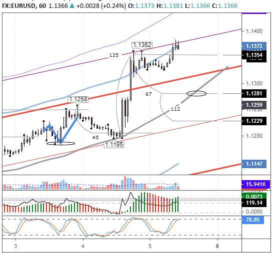 Пара стартанула от линии lb (1,1195) после оглашения решения ЕЦБ и усилилась после пресс-конференции главы ЕЦБ Кристин Лагард. За четыре часа цена отклонилась от балансовой линии больше чем на 1%. Рост замедлился на уровне 1,1362, после чего пара перешла в боковое движение. В пятницу, 5 июня, на торгах в Азии евро подорожал на 0,34%, до 1,1376. Покупатели сдвинули максимум по линии U3 на 1,1383.