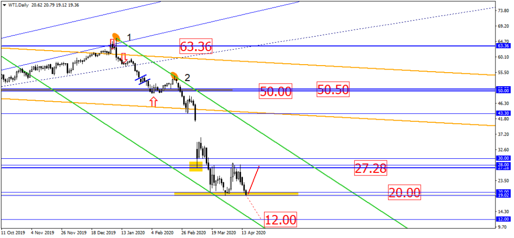 Нефть WTI потихоньку, после решения ОПЕК+ о рекордном сокращении добычи, опустилась до уровня 19.00. Пока всё похоже на то, что нефть трамбует нижнюю сторону диапазона, сформированного уровнями 19.00 и 28.00. А, в перспективе, можно ожидать дальнейшее превращение диапазона в двойное дно. Поэтому, наблюдаем за свечными сигналами и ориентируемся на базовый сценарий – ограниченный рост черного золота.