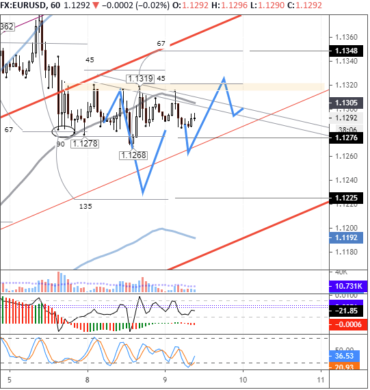 На торгах в Азии основные валюты находятся в минусе, кроме йены и франка. Выше мы написали, что йена является защитным активом. Пока фондовые индексы росли, кто-то выводит капитал в йену. Отсюда возникает вопрос: при бегстве в защитные активы евро разве подорожает? Нет, не подорожает. Поэтому по прогнозу рассматриваем рост до 1,1325. Если кроссы все развернутся вверх, то тогда цена по тренду быстро поднимется до 1,1348/50. По циклам получается, что давление на евро нужно ожидать в конце недели.