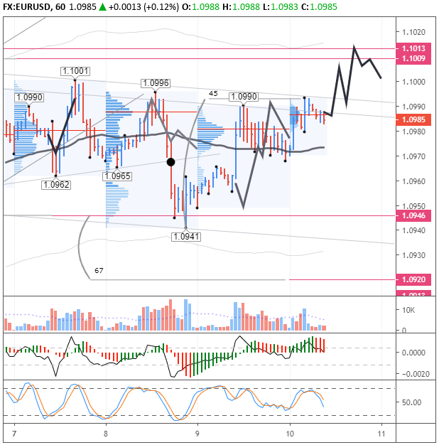В среду, 9 октября, торги по паре евро/доллар завершились ростом. Основные валюты подорожали к доллару в ответ на позитивную новость о том, что Китай готов пойти на увеличение закупок соевых бобов в США и заключить промежуточное торговое соглашение, чтобы избежать повышения пошлин на китайские товары с 15 октября. На новостях «бычий» импульс угас на уровне 1,0990. К закрытию дня пара вернулась к балансовой линии.