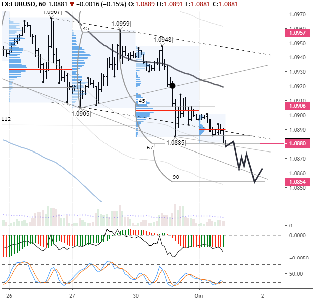 По прогнозу мы рассматриваем снижение до 90 градуса, 1,0854. Чуть выше проходит линия, которая является проекцией минимумов: 1,0966 (23.09) и 1,0905 (27.09).