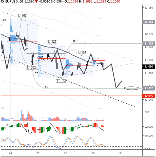 Цена прошла по прогнозу с небольшими отклонениями. Коррекция позволила индикаторам разгрузиться, и сейчас пара готова к погружению на 1,1057. Текущий курс 1,1090. Ускорения вниз стоит ожидать при падении курса ниже 1,1085. Между таймфреймами есть разногласия, поэтому от трендовой линии рассмотрел небольшой откат вверх.