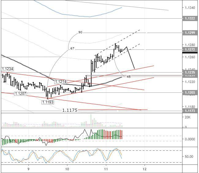 На момент подготовки обзора евро торгуется на уровне 1,1269. Так как рост остановился на 67 градусе, и сформировалась медвежья дивергенция между ценой и АО, то по прогнозу рассмотрел нисходящую коррекцию до 1,1240. Пунктирными линиями выделили канал, из которого ждем выхода цены вниз. 45 градус расположен на уровне 1,1230. Это та зона, если коррекция усилится по Down-тренду.