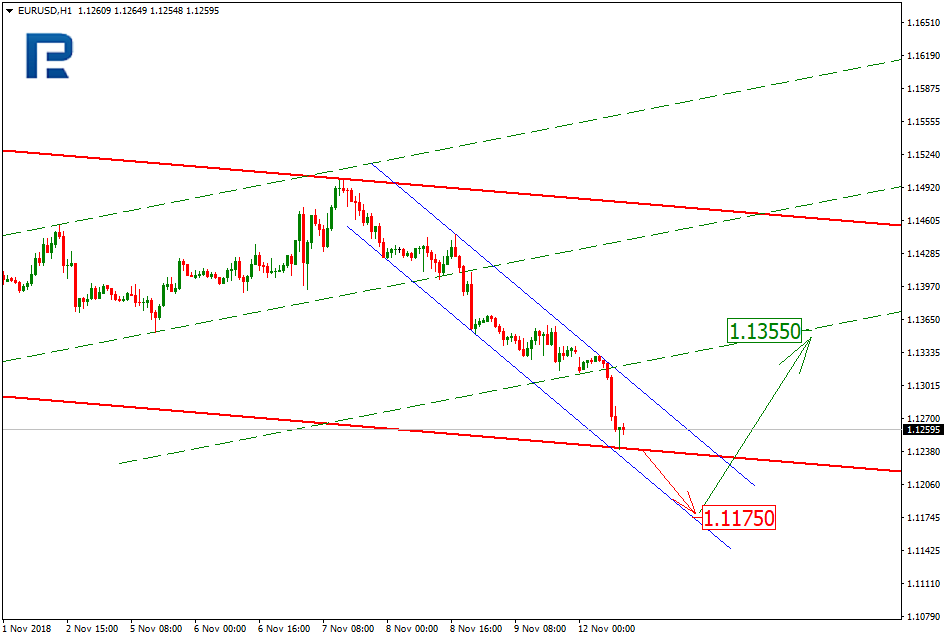 В настоящий момент краткосрочный тренд снижения тестирует линию поддержки основного канала. Развитие краткосрочного нисходящего тренда направлено на достижение уровня поддержки — 1,1175. После этого можно ожидать формирование коррекционного тренда роста к уровню сопротивления на 1,1355.