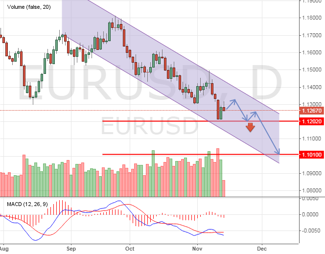 В текущих рыночных фундаментальных и технических условиях не приходится рассчитывать на возвращение рынка выше отметки 1.1300, скорее следует ожидать снижения курса в срединную область указанного диапазона — 1.1020.