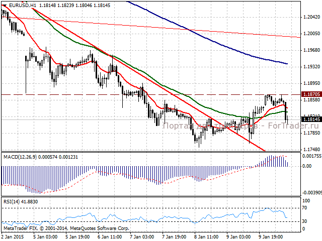 На часовом графике отчетливо видно, как цена, двигавшаяся в рамках нисходящего тренда, преодолела линию сопротивления, совпадавшую с ЕМА 50 (зеленого цвета), и оттолкнулась от нее, начав формировать краткосрочный восходящий тренд. Сильным сопротивлением для цены стал уровень 1,1870.