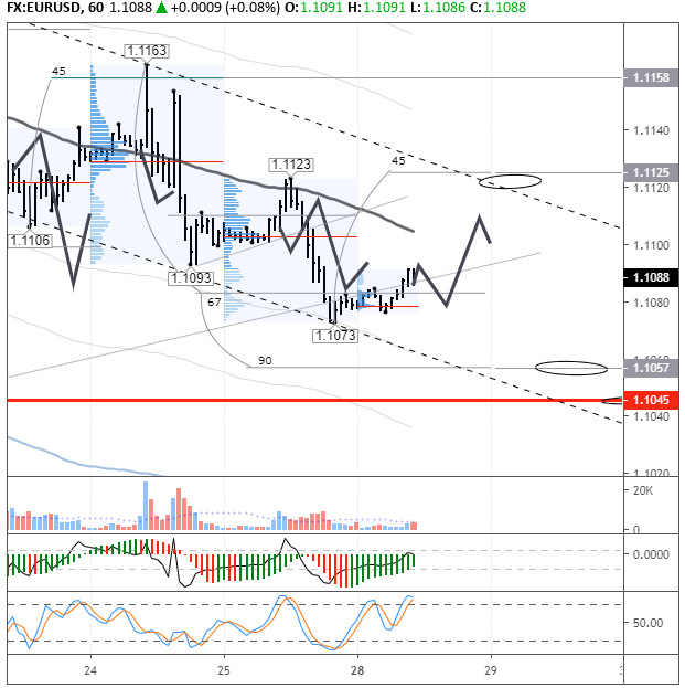 Ожидания по пятнице оправдались. Цена на европейской сессии восстановилась до балансовой линии, от которой упала до 1,1073.