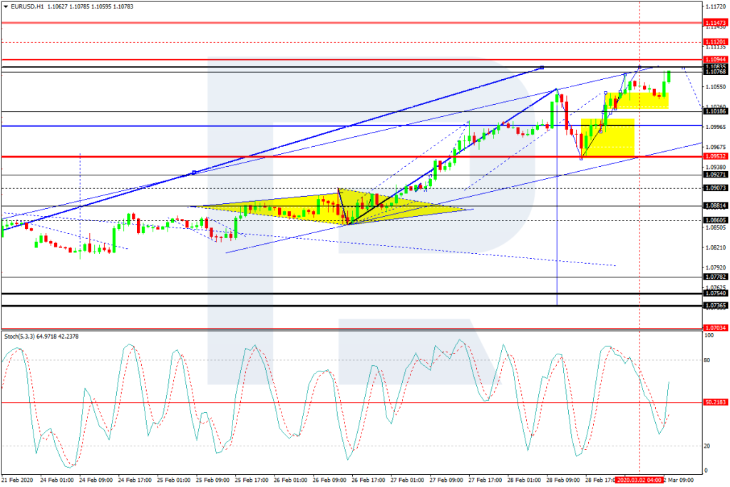 На графике H1 пара EURUSD наторговала узкий диапазон консолидации вокруг уровня 1.1038. Рассмотрим возможность отработки уровня 1.1083. После этого ожидаем снижение до 1.1000. А с пробоем этого уровня вниз откроется потенциал на снижение к первой расчётной цели — 1.0900.. Технически такой сценарий подтверждает и осциллятор Stochastic. Его сигнальная линия пробила отметку 50 вниз, что предупреждает о близком начале развития очередной волны снижения.