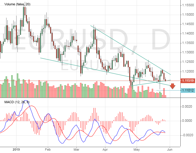 Глобальный нисходящий тренд в паре EUR/USD, начавшийся в феврале прошлого года, по всей видимости, замедляется. Ни торговая война США и Китая, ни рост рисков жесткого Brexit, ни выборы в Европарламент и угроза политического кризиса так и не смогли придать европейской валюте импульс для направленного движения.