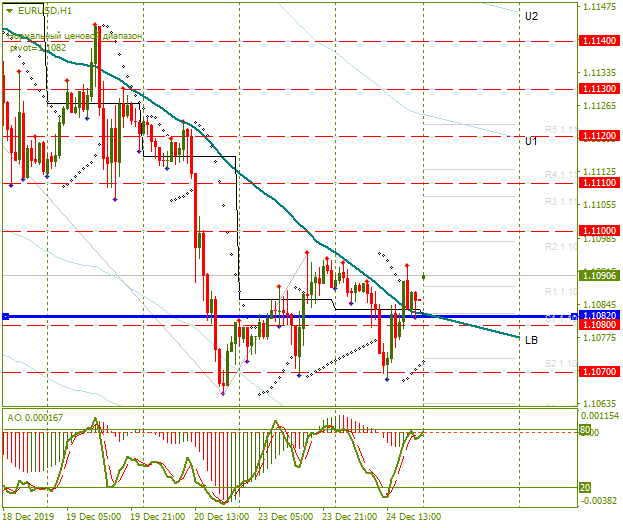 - Осциллятор стохастик находится около зоны перекупленности (возможен локальный откат вниз, к уровню pivot 1.1082).