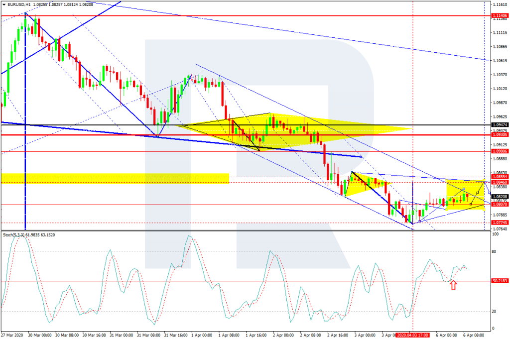 EURUSD, H4На графике H1 пара EURUSD отработала локальную цель первой волны роста. В моменте рынок исполнил коррекцию к уровню 1,0807. Ожидаем продолжение роста к 1,0847 (как минимум). После этого рассмотрим возможность развития коррекции к уровню 1,0800. Технически такой сценарий подтверждается и осциллятором Stochastic. Его сигнальная линия торгуется выше отметки 50, что предполагает ее рост к отметке 80 для завершения волны роста. После отработки этого уровня возможно снижение сигнальной линии к уровню 50, что приведет к коррекции ценового графика.
