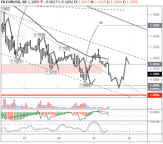 Ожидания по обновлению минимума оправдались. Имеем четыре понижающихся основания и отскок до 1,1028. Созданы технические условия для коррекции до 1,1050 (45 гр.), только вряд ли получится у покупателей поднять цену на этот уровень из-за Китая.