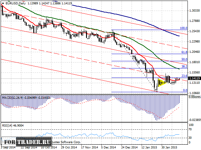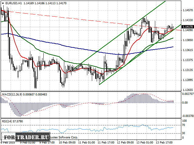 На часовом графике можно обозначить восходящий тренд. Цена находится у срединной линии среднесрочного нисходящего тренда (красная пунктирная линия). Ориентируясь на краткосрочный восходящий тренд (обозначен зелеными линиями), можно построить краткосрочный прогноз пары евро доллар с технической целью роста на уровне 1,15.