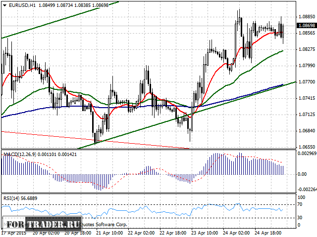На часовом графике можно построить краткосрочный восходящий тренд, линия поддержки которого на данный момент совпадает с ЕМА 200 (синего цвета). Цена пыталась преодолеть веер скользящих средних и линию поддержки тренда, однако закрепиться ниже ей не удалось, и пара евро доллар вернулась в рамки ап-тренда.