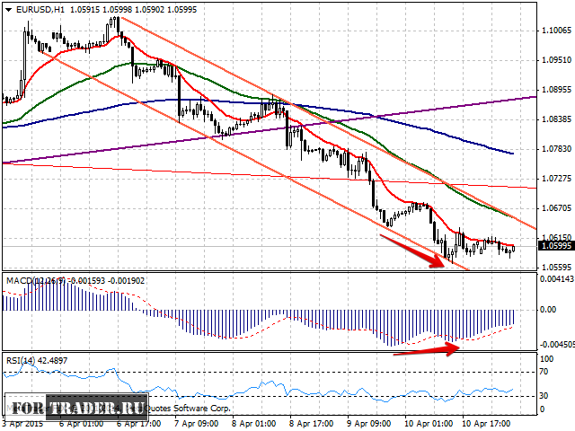 На часовом графике можно построить краткосрочный нисходящий тренд (обозначен красными линиями). Цена находится в середине канала и пытается преодолеть сопротивление, которое оказывает ЕМА 14 (красного цвета). Если это ей удастся, следующей целью станет ЕМА 50 (зеленого цвета) на уровне 1,0640, совпадающая с линией сопротивления нисходящего тренда.