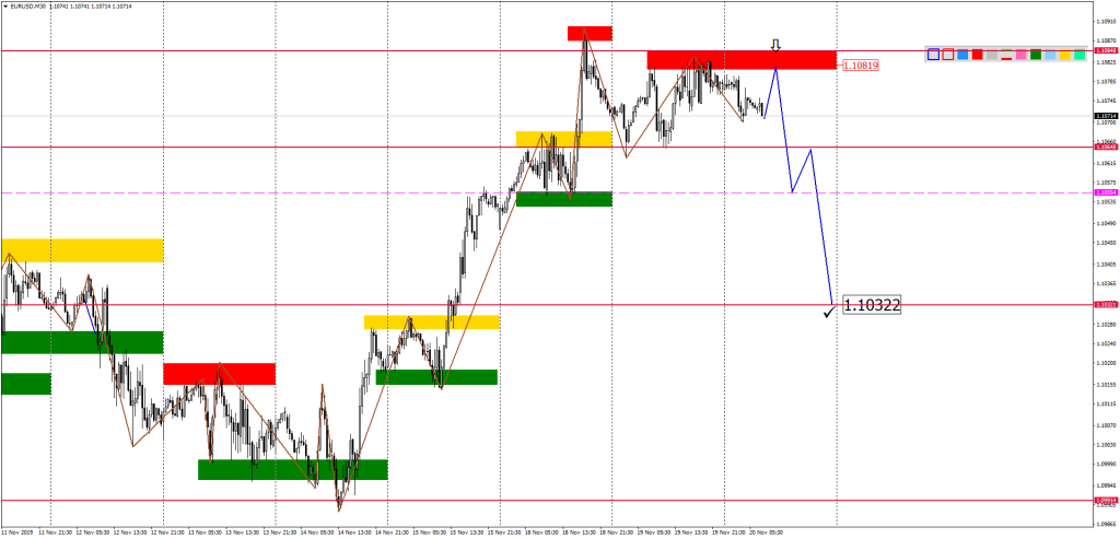 Пара EURUSD на прошлой торговой сессии консолидировалась в узком диапазоне, пытаясь преодолеть уровень сопротивления на 1,1084. Очевидно, что продавцы достаточно сильны, поэтому вероятное снижение цены все еще остается в силе. Дневное сопротивление ожидается в районе 1,1081 (красная зона), которая, вероятно, не даст цене пройти выше. Тест и отбой от этого уровня откроет дорогу к уровню поддержки в районе 1,1032.