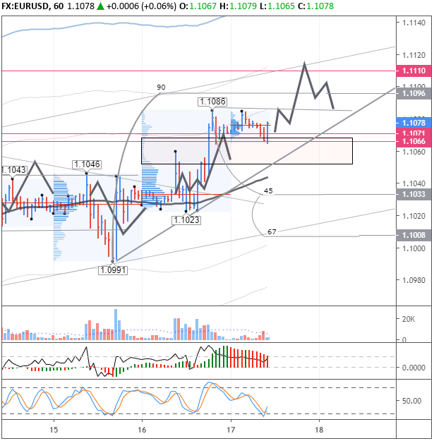 Ожидания по вчерашнему дню полностью оправдались. Цена достигла прогнозируемого уровня 1,1070. Максимум был зафиксирован на отметке 1,1088.