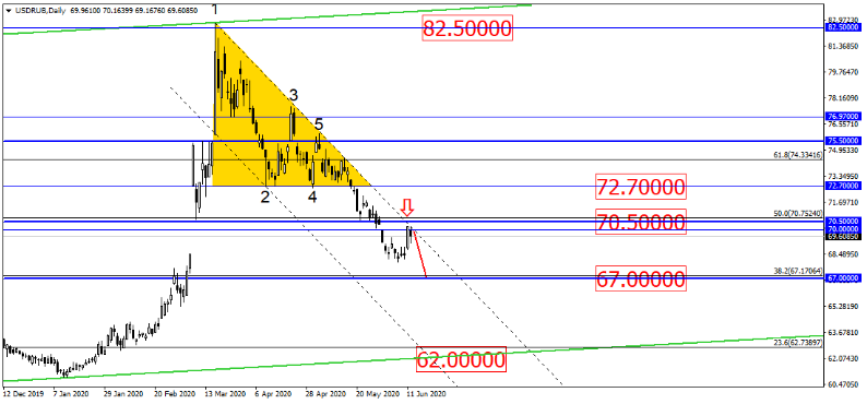 Пара USD/RUB, на прошлой неделе, подошла к уровню 70.00 и линии нисходящего канала, что сигнализирует о потенциале снижения котировок на следующей неделе. Пока ожидаемый потенциальный уровень для снижения – 67.00: