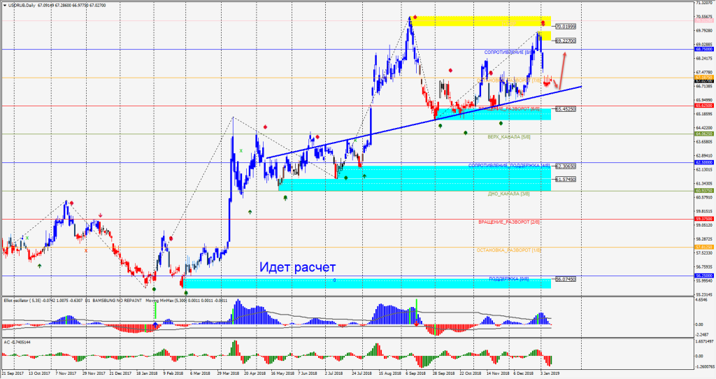 На дневном графике пары USD/RUB формируется техническая фигура продолжения нисходящего тренда «Перевернутый флаг» с нижней границей «полотнища» на уровне 66,65 руб/доллар. Наряду с этим, Банк России с 15 января возвращается на внутренний рынок с валютными интервенциями, а цена на нефть возобновила снижение.