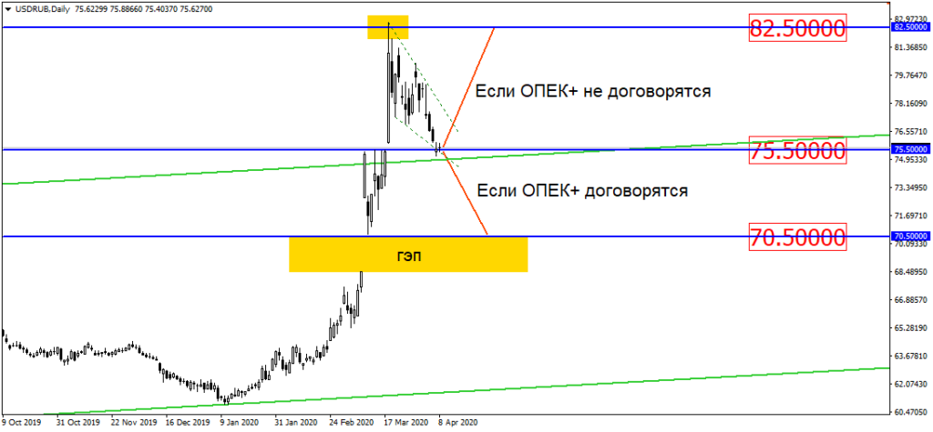 Российский рубль второй день подряд ушёл в подполье, и рисует волчки на графике пары USD/RUB. Ничего удивительного в этом нет – рубль, как и нефть, ждут завтрашнего виртуального заседания ОПЕК+, на котором будут пробовать прийти к скоординированным действиям, чтобы подтолкнуть нефтяные котировки вверх. А что хорошо для «черного золота», то хорошо и для российской валюты. Поэтому, имеем два сценария на текущий момент, пока не принято окончательное решение Картеля – рост USD/RUB до 82.50 или падение до 70.50, в зависимости от итогов заседания. Наш базовый сценарий – что решение о сокращении добычи нефти согласуют: