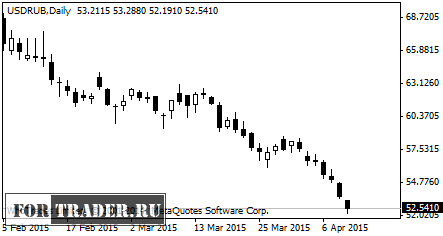 Официальный курс доллара США к рублю на 10 апреля 2015 года, установленный Банком России, составляет 52,5424 руб/долл, что на 1 рубль 48,46 копейки меньше предыдущего.