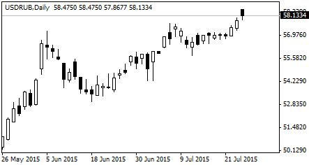 Сегодня, 24 июля, валютная пара доллар/рубль начала торги гэпом вверх на уровне 58,4750 руб/доллар. На момент написания обзора гэп закрыт, однако торги продолжаются выше отметки 58 руб/доллар.