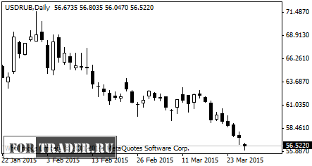 Сегодня, 26 марта, торги по валютной паре доллар/рубль начались гэпом вниз. Таким образом, курс доллара США к рублю опустился ниже уровня 57 руб/доллар и обновил годовой минимум.