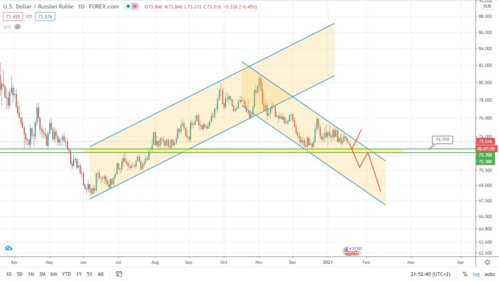 Российский рубль подходит к уровню 72.70, но потихоньку вырисовывается вариант с пробитием этого уровня вниз. Второй вариант – отскок – тоже не будем сбрасывать со счетов. Здесь важно понаблюдать за ценой возле уровня. В общем, USD/RUB у ключевой цены: