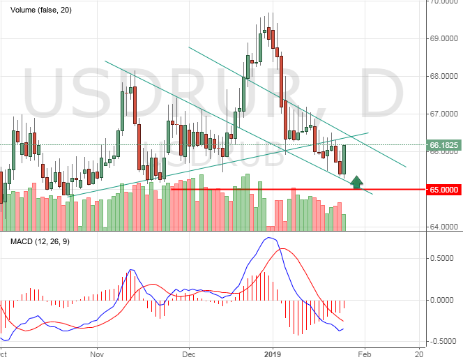 Вблизи 65 за доллар находится очень серьёзная область поддержки валюты. Уточню, что это не точный уровень, выше которого быки будут стоять насмерть, а после — стоит ждать капитуляцию. В данном случае мы говорим об области 65-66, откуда доллар выкупают с октября прошлого года. Точно также и сейчас.