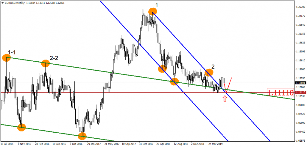 По единой валюте, на недельном графике, цена возвращается к точке пересечения двух пробитых нисходящих каналов и горизонтальному уровню 1.1111: