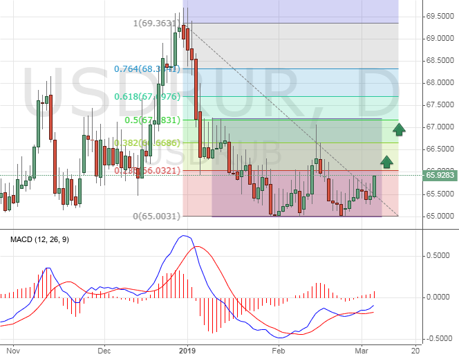 На мой взгляд, действия ЦБ РФ вряд могут стать причиной резкого ослабления курса рубля, но помешать его более динамичному укреплению вполне способны. В связи с чем, базовый сценарий движения пары рубль/доллар в марте предполагает диапазон 64,90 – 67,20.