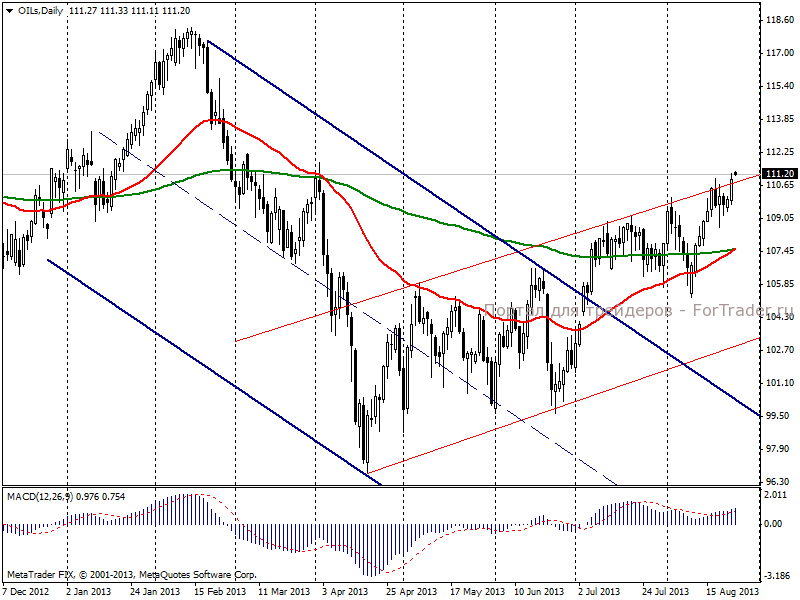 На торгах в пятницу, 23 августа, нефть Brent продемонстрировала уверенную положительную динамику, поднявшись до 111,1 долл/баррель и прибавив 1,14%. В очередной раз маркетмейкером на рынке нефти выступил Ближний Восток. Сложившуюся там ситуацию сложно назвать однозначной. Как только из новостных лент исчезают одни новости, сразу же появляются другие. Отодвинув на задний план угрозу гражданской войны в Египте и проблемы нефтяных терминалов в Ливии, первое место в новостных топах заняли события в Сирии и Ливане. В пятницу ВВС Израиля нанесли удар по военным целям в Ливане, в ответ на ливанскую ракетную атаку. Представители сирийской оппозиции обвиняют официальные власти в применении химического оружия, в результате которого погибло 1600 человек. Продолжаются переговоры британского и американского правительства о совместной военной операции против Сирии. В случае достижения консенсуса, вторжение ВМС Великобритании и США в Сирию может начаться уже на следующей неделе.