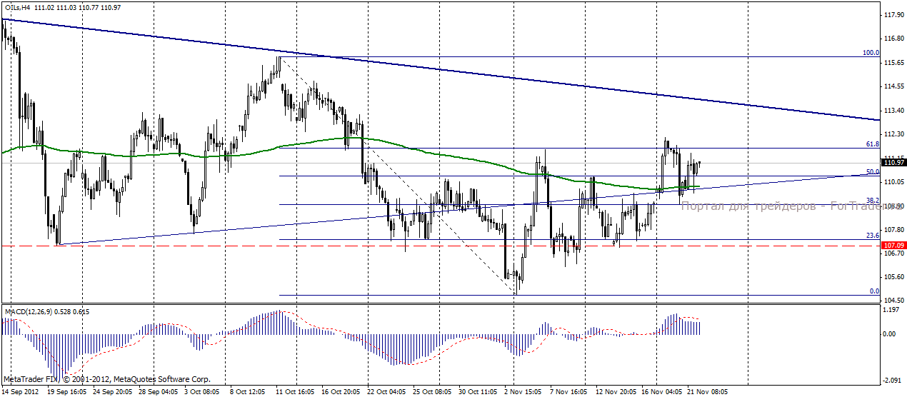 На прошедших в среду, 21 ноября, торгах нефть Brent продемонстрировала положительную динамику, поднявшись до отметки 110,86 долл/баррель и прибавив 0,73%, отыграв рост понедельника. Будоражащие рынок нефти слухи о достижении перемирия между правительством Израиля и руководством движения ХАМАС получили подтверждение, что спровоцировало резкое падение нефтяных котировок. Но уже во второй половине дня, после выхода данных Министерства Энергетики США, показавших уменьшение запасов нефти на 1,47 млн. баррелей против прогнозируемых 1 млн. баррелей, «черному золоту» удалось отыграть потери. Поддержали котировки нефти и данные по рынку труда США.