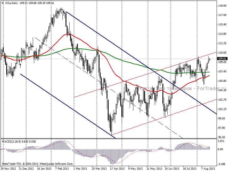 На торгах в четверг, 15 августа, нефть Brent продемонстрировала восходящую динамику, повысившись до 109,60 долл/баррель и прибавив 0,72%. На руку нефтяным котировкам сыграли слабые данные по промышленному производству в США и производственному индексу ФРБ Филадельфии, ослабившие американский доллар. Продолжается гражданское противостояние в Египте, усиливающее опасения срыва поставок нефти через Суэцкий канал. В стране введен режим чрезвычайного положения, погибло несколько сотен человек. Представительство англо-голландской нефтяной компании Royal Dutch Shell уже закрыто из-за риска для жизни сотрудников. Тем не менее, британские компании BP и BG пока работают на территории Египта в обычном режиме.