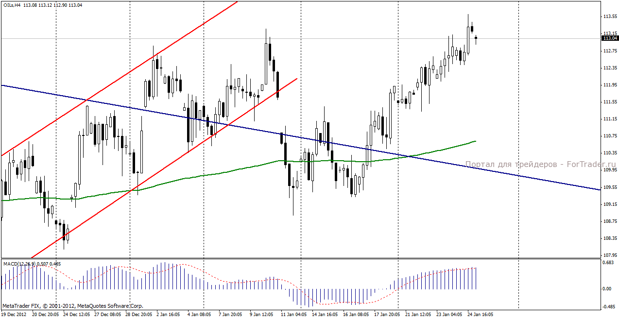 На прошедших в четверг 24 января, торгах нефть Brent продемонстрировала положительную динамику, поднявшись до 113,28 долл/баррель и прибавив 0,43%. Поддержку нефтяным котировкам оказывала положительная экономическая статистика. Рост производственного PMI Китая, опубликованного с утра, дал основания предполагать увеличение потребления нефти нефтепродуктов в Поднебесной. Продолжили эстафету позитива для нефти данные по количествам заявок на пособие по безработице в США, снизившиеся до пятилетнего минимума.