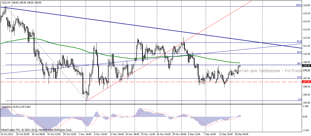 На прошедших во вторник, 18 декабря, торгах нефть Brent продемонстрировала положительную динамику, поднявшись до отметки 108,84 долл/баррель и прибавив 1,11%. Поддержку нефтяным котировкам оказали оптимистические настроения инвесторов по поводу решения проблемы «фискального обрыва», основанные на достижении консенсуса в переговорах между политическими силами США. Ожидается, что соглашение между Белым Домом и республиканцами будет подписано в пятницу. Опубликованный вчера отчет Американского института нефти API запасы нефти уменьшились на 4,1 млн. баррелей против прогнозируемых 1,03 млн. баррелей.