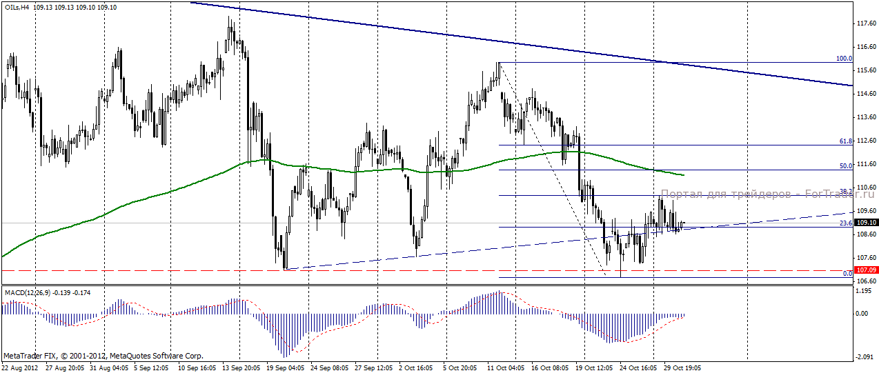 На торгах во вторник 30 октября нефть Brent демонстрировала негативную динамику, понизившись до 109,08 долларов за баррель и потеряв 0,33%. В отсутствие публикаций важной макроэкономической статистики из Европы и США нефтяные котировки оказались под давлением, вызванным действиями урагана на американском северо-восточном побережье. Неуверенность торгов объясняется отсутствием на рынке американского капитала уже второй день подряд. Напомним, что из-за угрозы человеческих жертв американские биржи в понедельник и вторник были закрыты. Как и прогнозировали эксперты журнала ForTrader, остановка работы, в связи с ураганом, шести нефтеперерабатывающих заводов и ключевого нефтепровода спровоцировала падение спроса на нефть, о чем свидетельствуют данные, опубликованные вчера Американским институтом нефти API, согласно которым недельные запасы нефти увеличились на 2,1 млн. баррелей вместо прогнозируемых 1,54 млн. Еще одним негативным фактором выступило снижение напряженности на Ближнем Востоке. Так, министр обороны Израиля заявил, что иранская ядерная программа не будет ускорена из-за опасений начала вооруженного конфликта.