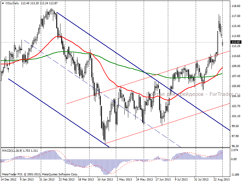 На торгах в пятницу, 30 августа, нефть Brent продемонстрировала отрицательную динамику, снизившись до 114,01 долл/баррель и потеряв 1,0%. Основным драйвером нефтяного рынка остается ситуация вокруг Сирии. Президент США Барак Обама допускает возможное военное вмешательство и без санкции Совета Безопасности ООН, но для этого необходимо получить одобрение Конгресса, который может собраться, самое раннее, 9 сентября.