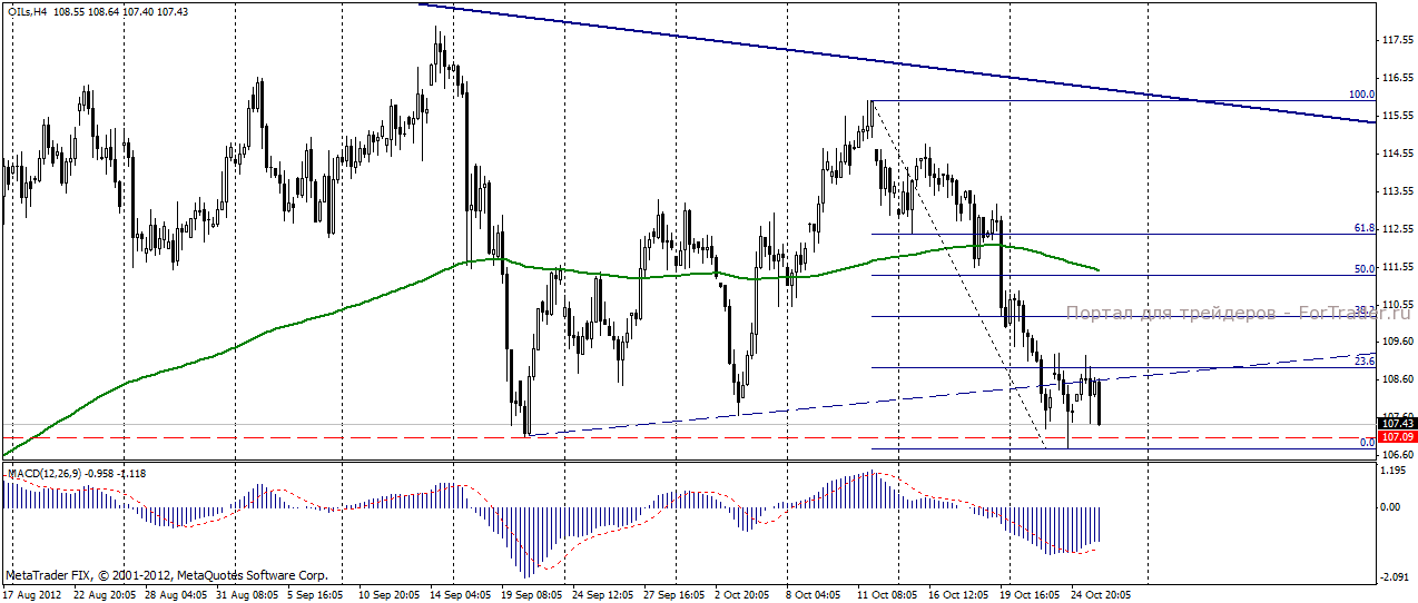 На торгах в четверг 25 октября нефть Brent, впервые за семь торговых сессий, продемонстрировала позитивную динамику, повысившись до 108,49 долл/баррель и прибавив 0,59%. Давление на нефтяные котировки всю неделю оказывали макроэкономические данные и рост опасений замедления глобальной экономики, следствием чего является падение спроса на нефть. Однако в четверг цена на «черное золото» получила передышку в виде пришедшей из США статистики, которая показала, что американцы настроены покупать товары длительного пользования, а заявки на пособие по безработице стали свидетельством небольшого улучшение на рынке труда. На фоне позитива из США нефть марки Brent сформировала коррекционный отскок. Однако, по мнению аналитиков журнала ForTrader, серьезного роста цен на североморскую смесь ждать не стоит. Продолжающаяся неопределенность на мировых площадках, укрепление доллара, в свете предстоящих 6 ноября выборов президента США, предстоящая публикация важных макроэкономических данных – вот факторы, не добавляющие оптимизма инвесторам.