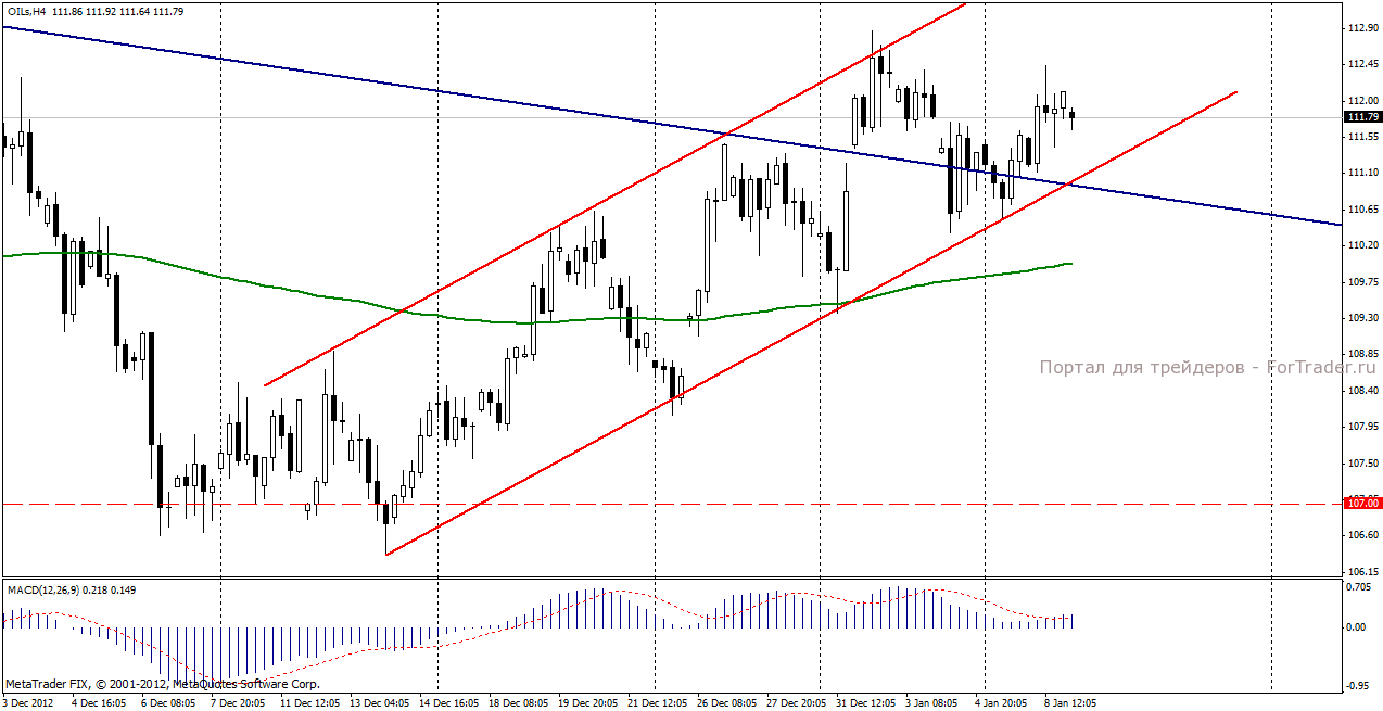 По мнению аналитиков журнала ForTrader, ситуация на рынке нефти остается стабильной, цена на нефть Brent находится в пределах боковика с границами 106,5-112,5 долл/баррель. Поддержку нефтяным котировкам сегодня будет оказывать вчерашний отчет Управления энергетической информации США, согласно которому в течении двухлетнего периода цены на нефть снизятся, а объемы добычи «черного золота» увеличатся за счет стран, не входящих в ОПЕК. Напомним, что в 2013 году ОПЕК запланировало снижение объемов добычи на 0,6 млн. баррелей в день, с целью поддержания цен на нефть на приемлемом уровне.