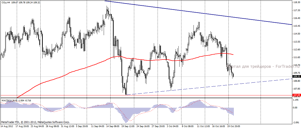 На торгах 22 октября цены на нефть Brent, уже пятую подряд сессию, демонстрировали отрицательную динамику, достигнув отметки 109,44 долл/баррель. Не смотря на увеличение количества спекулятивных лонгов (по данным Intercontinental Exchange ), цена прошла середину торгового диапазона и направляется к ключевому уровню поддержки 107 долл/баррель.
