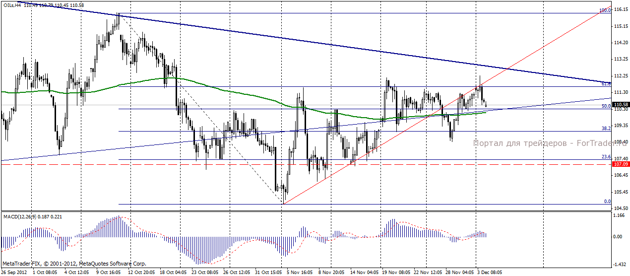 На прошедших в понедельник, 3 декабря, торгах нефть Brent продемонстрировала негативную динамику, опустившись до отметки 110,92 долл/баррель и потеряв 0,28%. Фактором давления на нефтяные котировки, как и предполагали эксперты журнала ForTrader, стала публикация американской экономической статистики: индекс PMI, вопреки ожиданиям, впервые за 4 месяца показал снижение производственной активности. Прошла и эйфория от оптимистичных заявлений политиков США о скором решении проблемы «фискального обрыва», что усилило опасения инвесторов и заставило их пересмотреть свои позиции.
