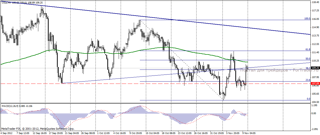 На пошедших в пятницу, 9 ноября, торгах нефть Brent продемонстрировала позитивную динамику, поднявшись до отметки 109,40 долл/баррель и прибавив 2%, сформировав отскок от ключевого уровня поддержки в 107 долл/баррель, как и предполагали эксперты журнала ForTrader. Укрепляющийся доллар не смог оказать существенного давления на рост нефтяных котировок и нефть марки Brent торговалась под влиянием технических факторов. Поддержку ценам на «черное золото» оказали позитивные данные по ежемесячному индексу цен на импорт и индексу настроения потребителей Мичиганского университета, опубликованные в США.