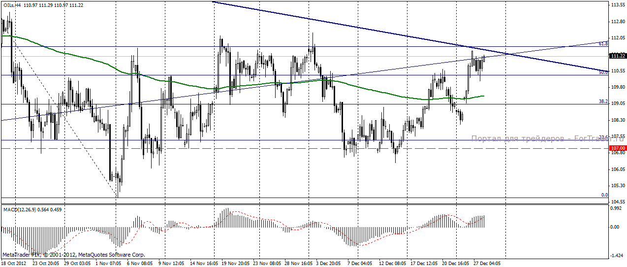 По мнению аналитиков журнала ForTrader, в связи с проведением еще одного раунда переговоров по вопросу «фискального обрыва» 30 декабря, нефть Brent будет чувствовать себя уверенно. Просадка котировок может быть вызвана закрытием позиций инвесторами из-за нежелания рисковать.