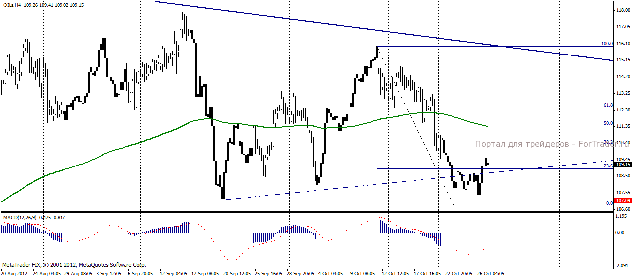 На торгах в пятницу 26 октября нефть Brent демонстрировала позитивную динамику, повысившись до 109,55 долл/баррель и прибавив 0,98%. На фоне опасений замедления глобальной экономики и падения спроса на нефть цена на «черное золото» смогла, как и предполагали эксперты журнала ForTrader, технический отскок от ключевого уровня поддержки 107 долл/баррель. Позитивным фактором для роста нефтяных котировок стала публикация данных по ВВП США за третий квартал, которая превзошла все прогнозы.